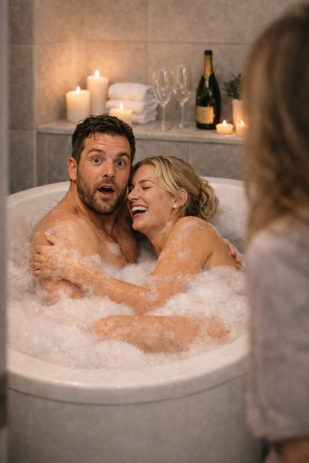 Diego è in piedi sul tappetino da bagno con un asciugamano avvolto male intorno alla vita, il petto bagnato, i capelli gocciolanti, il viso pallido come il latte scremato. Valeria è ancora per metà nella vasca, cercando di coprirsi con le bolle che hanno già iniziato a sgonfiarsi. Il rossetto è sbavato, il mascara colato, e l’espressione sul suo viso all’inizio non è di vergogna. È paura. Non perché ciò che ha fatto sia sbagliato, ma perché ha finalmente perso il controllo su chi la vede.