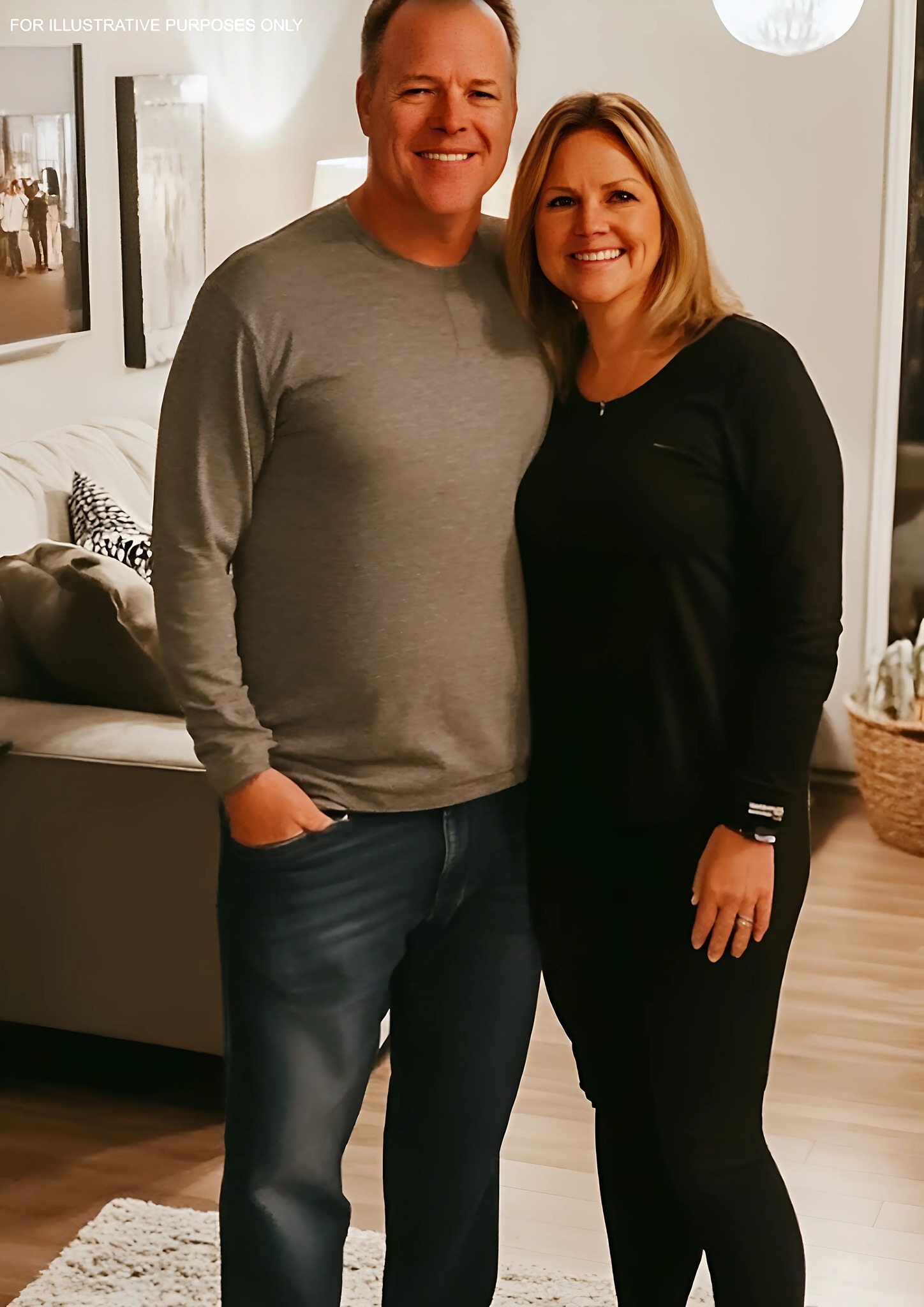 Era in piedi al centro della stanza, con un braccio intorno a una donna che indossava un vestito rosso aderente.