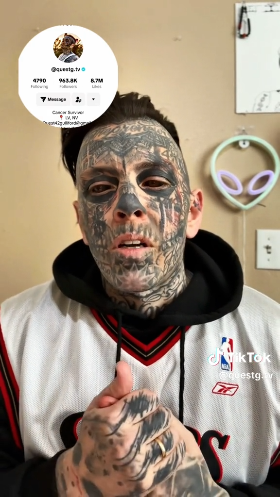 Quest Gulford di Las Vegas, Nevada, secondo quanto riferito, ha iniziato il suo percorso di modificazione del corpo nel 2009. Da allora ha speso 70.000 dollari in innumerevoli tatuaggi e procedure volte a modificare il suo aspetto.